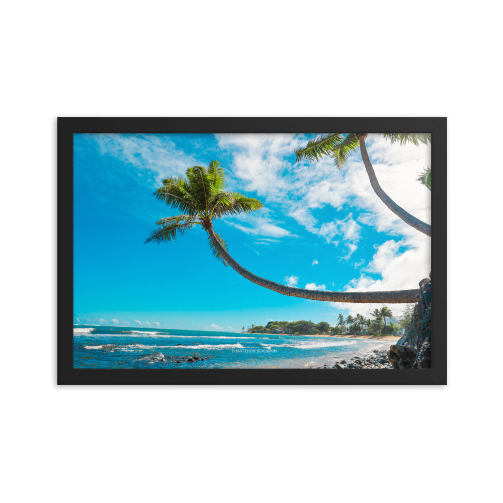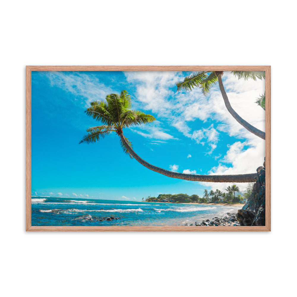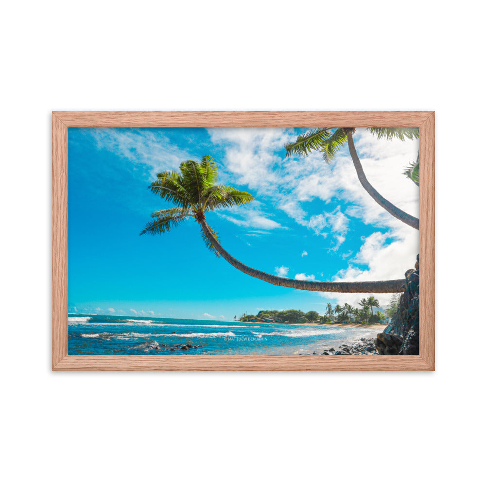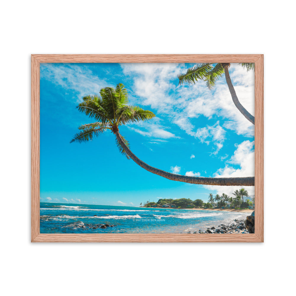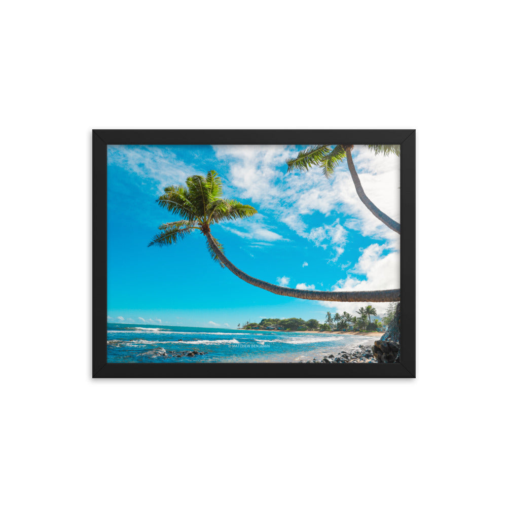 I love this palm tree. It shows that just because you're unconventional, it doesn't mean you lack beauty. This was on an island excursion where I drove around Hawaii, finding neat shops, great food, scenic twists and turns of the roads, and this beautiful palm tree. This drive was deep into the island. It was so deep that I couldn't get radio stations to work in the car. This is a framed poster printed on high-quality paper, with a partly glossy, partly matte finish.
