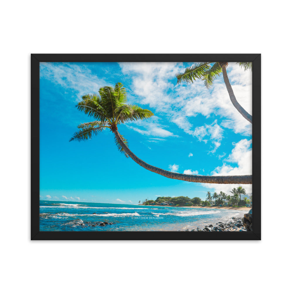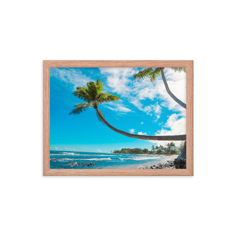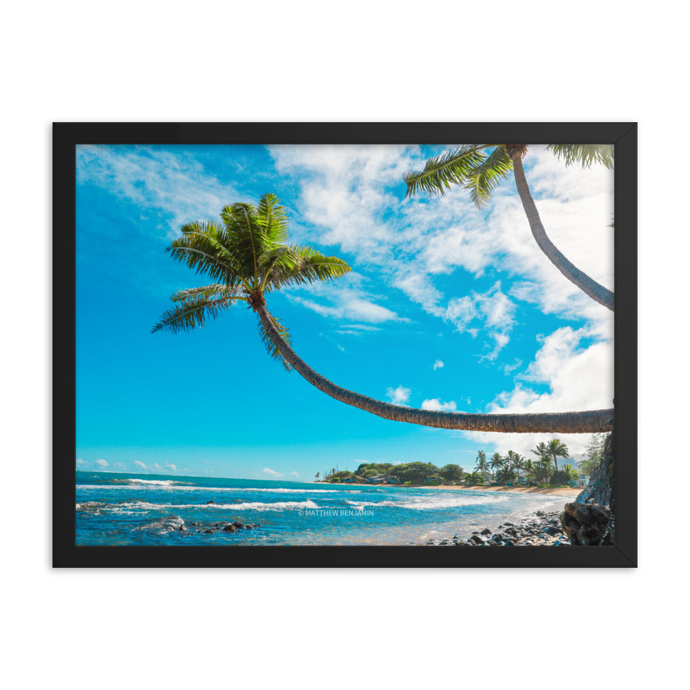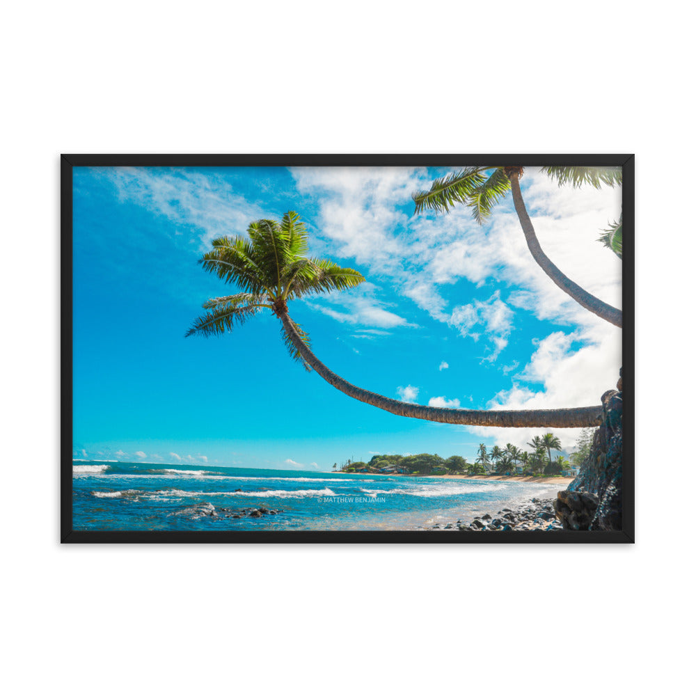 I love this palm tree. It shows that just because you're unconventional, it doesn't mean you lack beauty. This was on an island excursion where I drove around Hawaii, finding neat shops, great food, scenic twists and turns of the roads, and this beautiful palm tree. This drive was deep into the island. It was so deep that I couldn't get radio stations to work in the car. This is a framed poster printed on high-quality paper, with a partly glossy, partly matte finish.