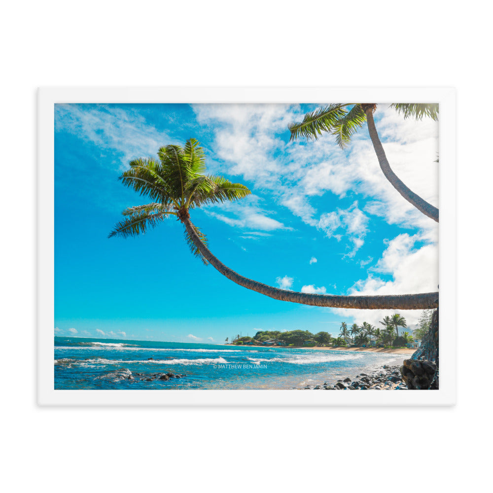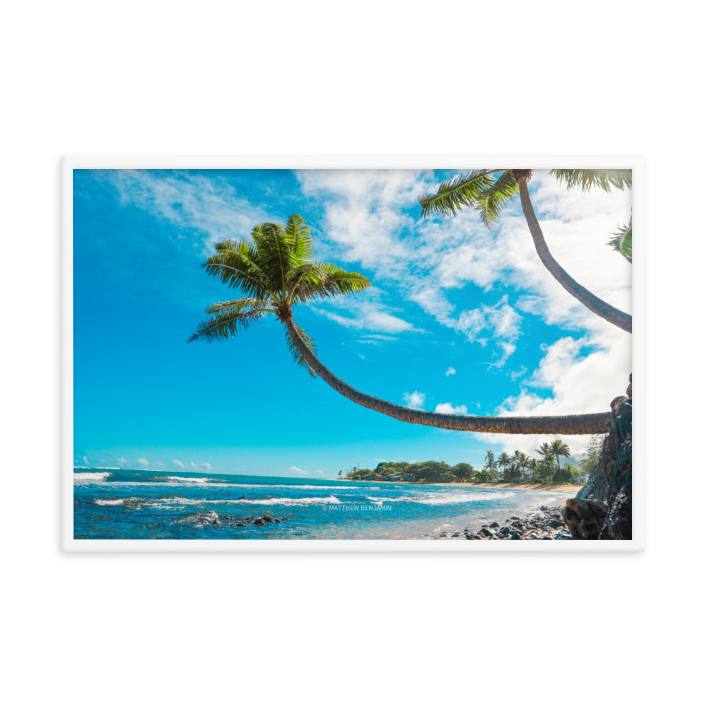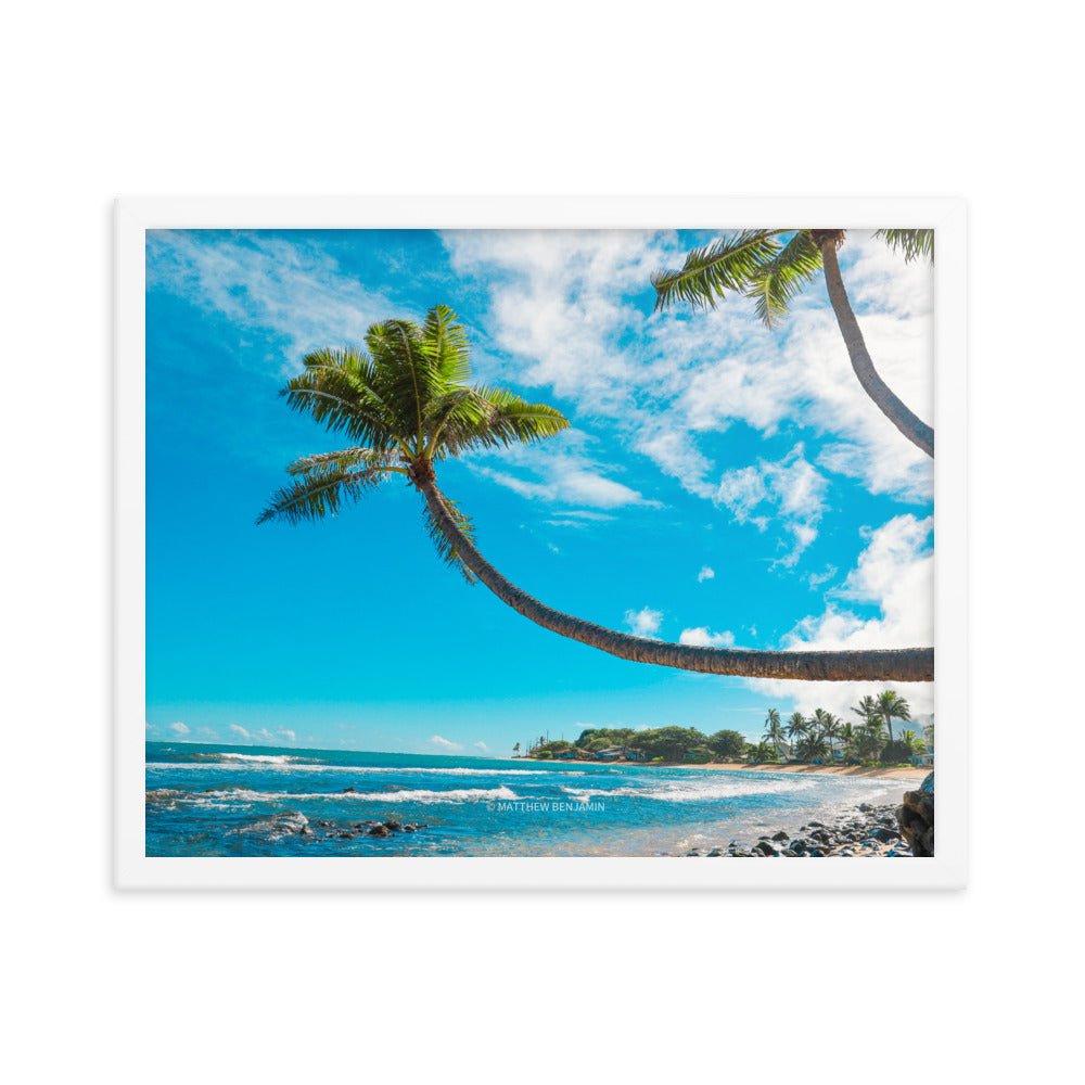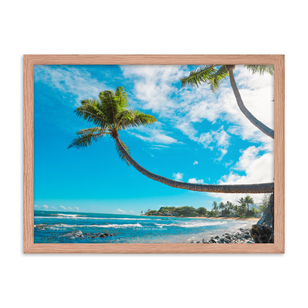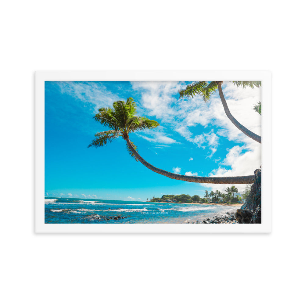 I love this palm tree. It shows that just because you're unconventional, it doesn't mean you lack beauty. This was on an island excursion where I drove around Hawaii, finding neat shops, great food, scenic twists and turns of the roads, and this beautiful palm tree. This drive was deep into the island. It was so deep that I couldn't get radio stations to work in the car. This is a framed poster printed on high-quality paper, with a partly glossy, partly matte finish.