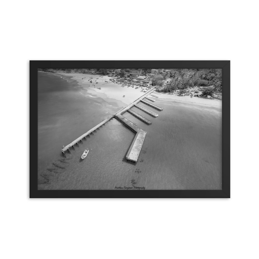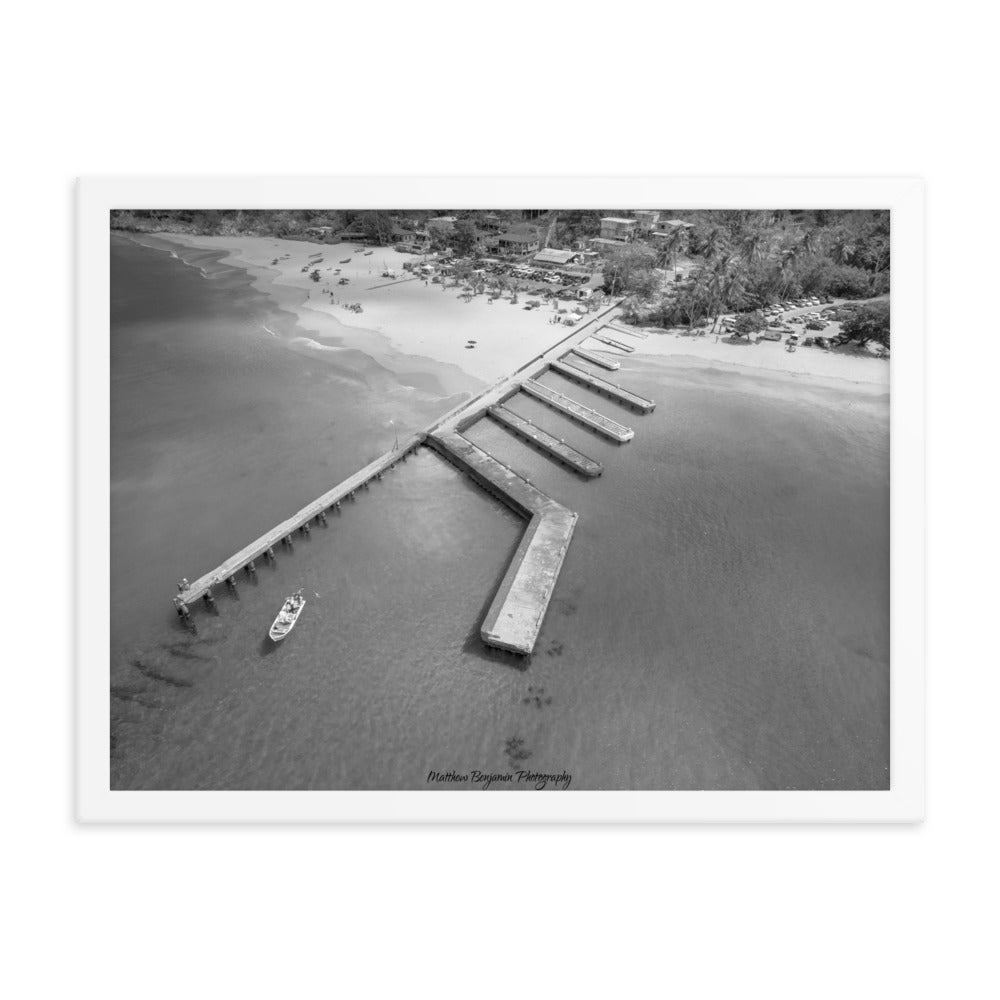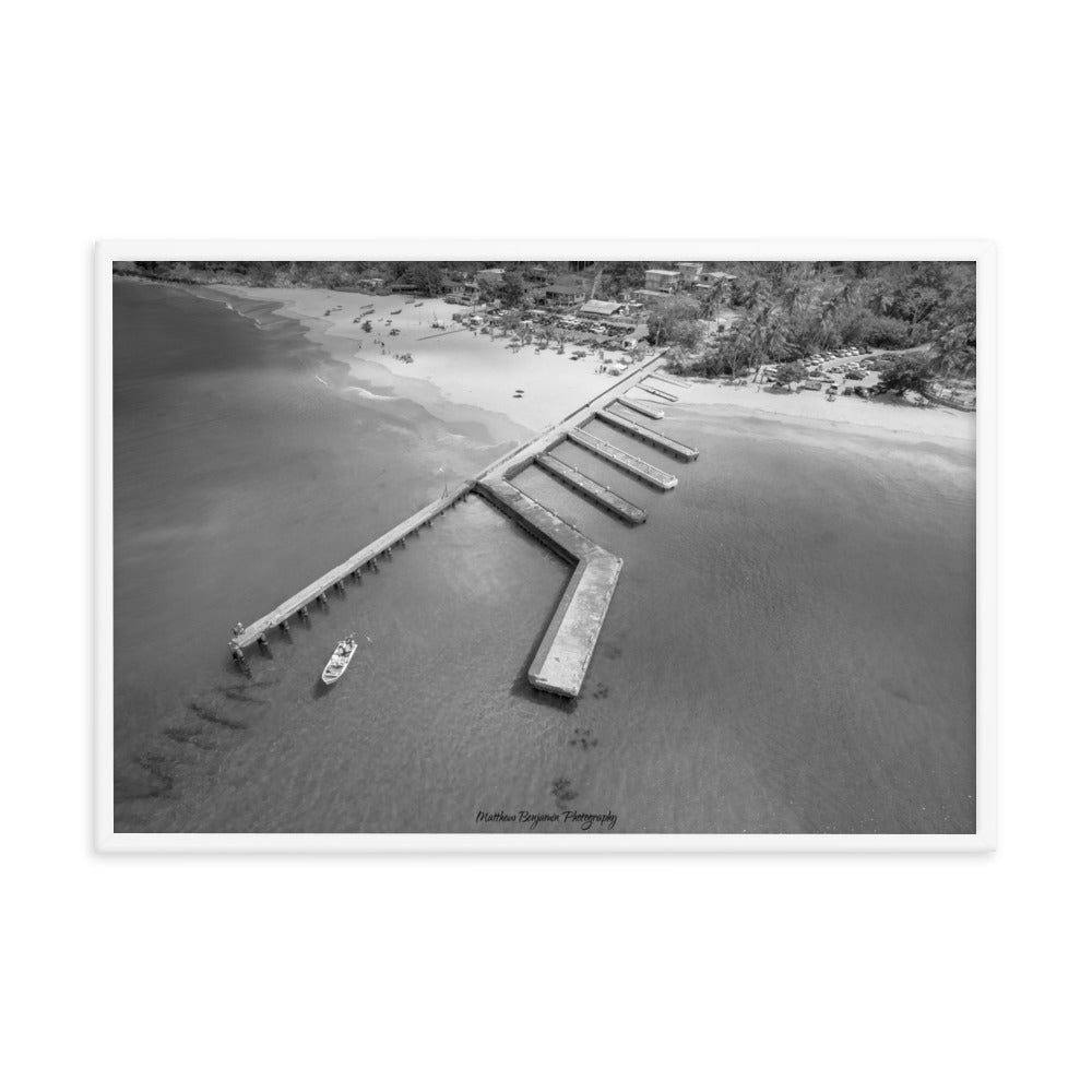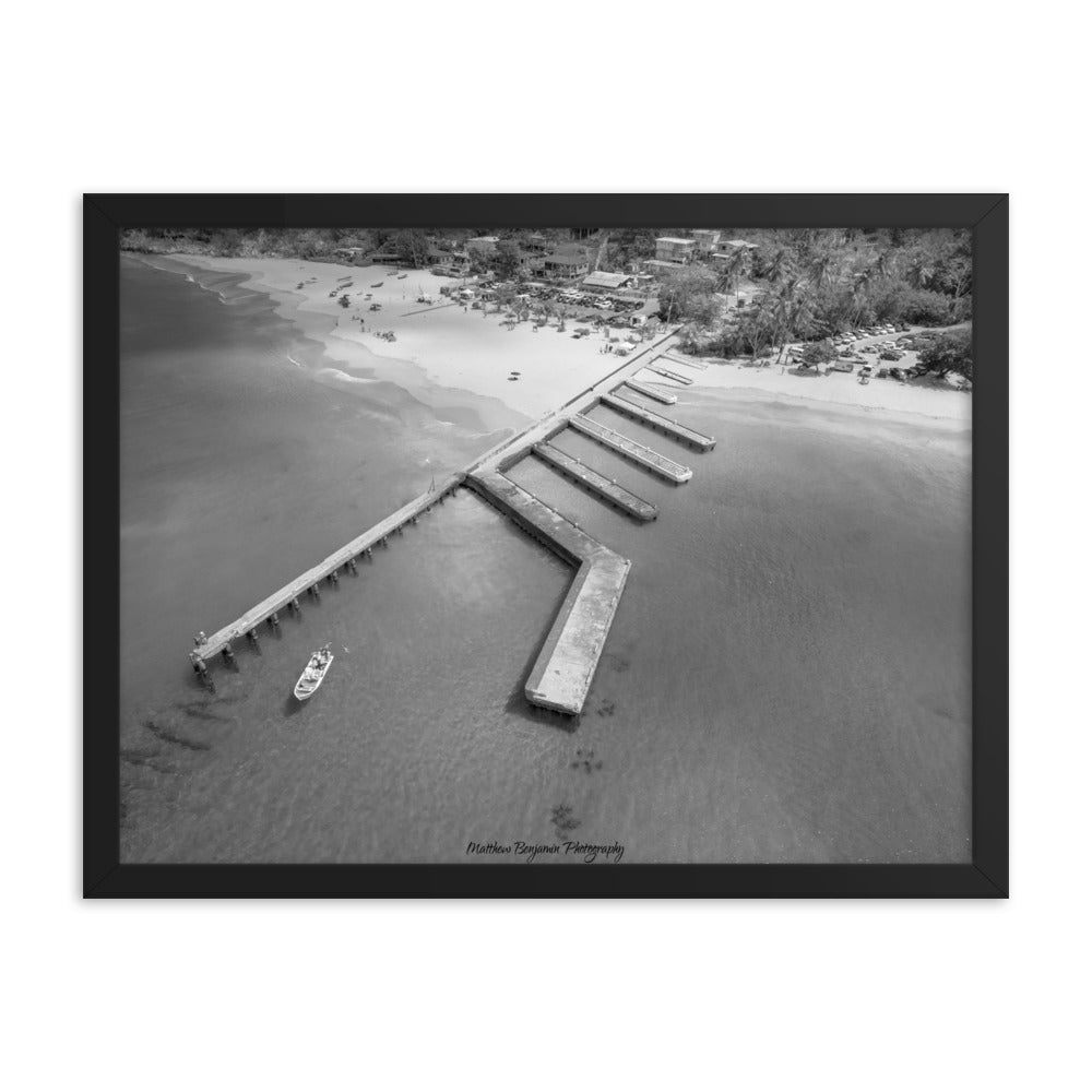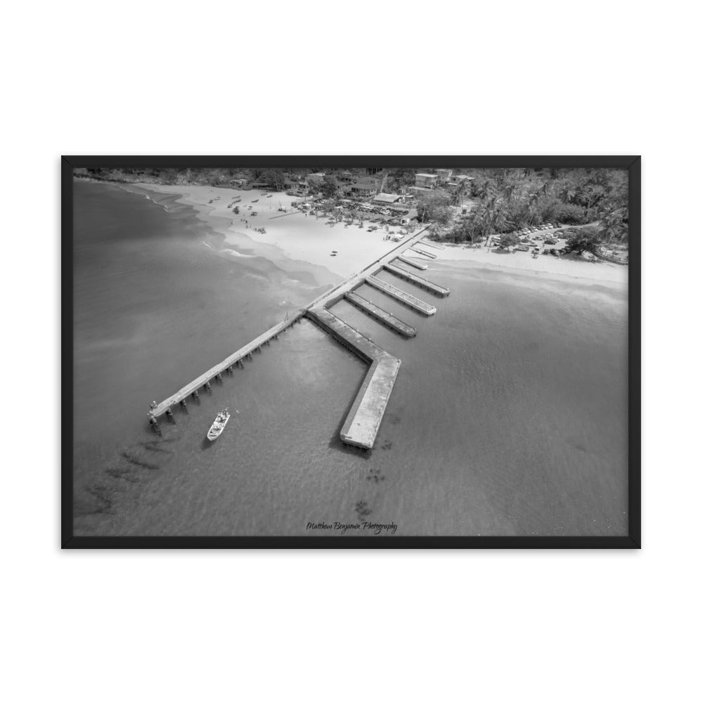 This is by far the most unique boat dock I've seen. This is located on the main island of Puerto Rico. In this black and white rendition you can see the contrast of how clear this water is and remains. This water was teaming with life and activity. I saw fish, crabs, and even human scuba divers! A very cool place to hang. Make a statement in any room with this framed poster printed on high-quality paper, with a partly glossy, partly matte finish.