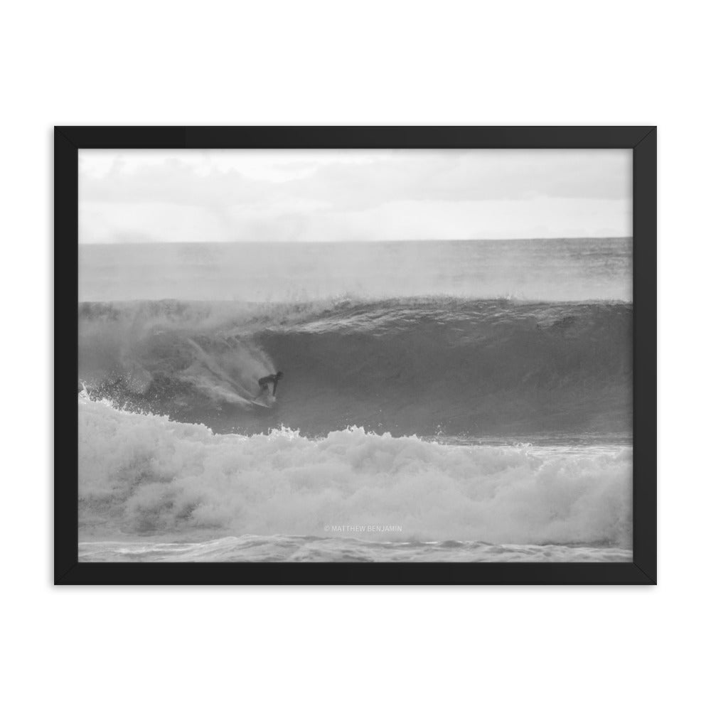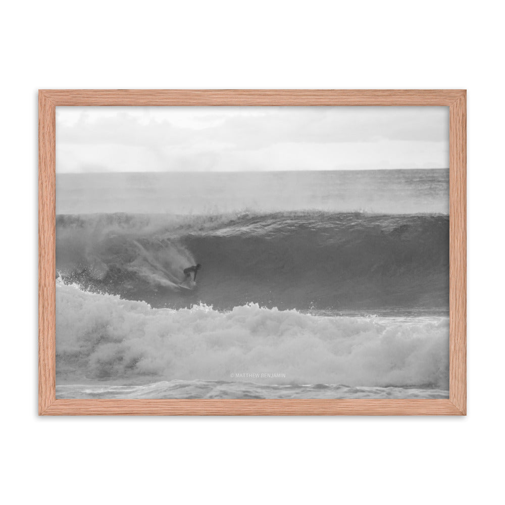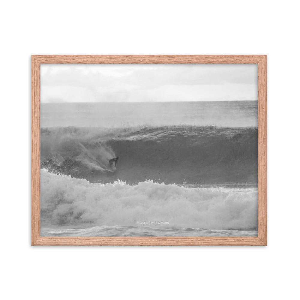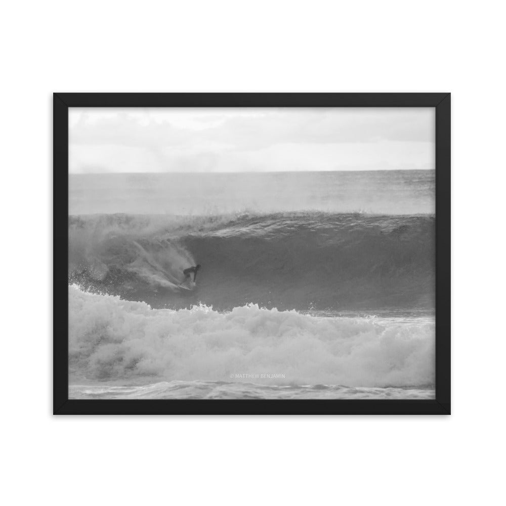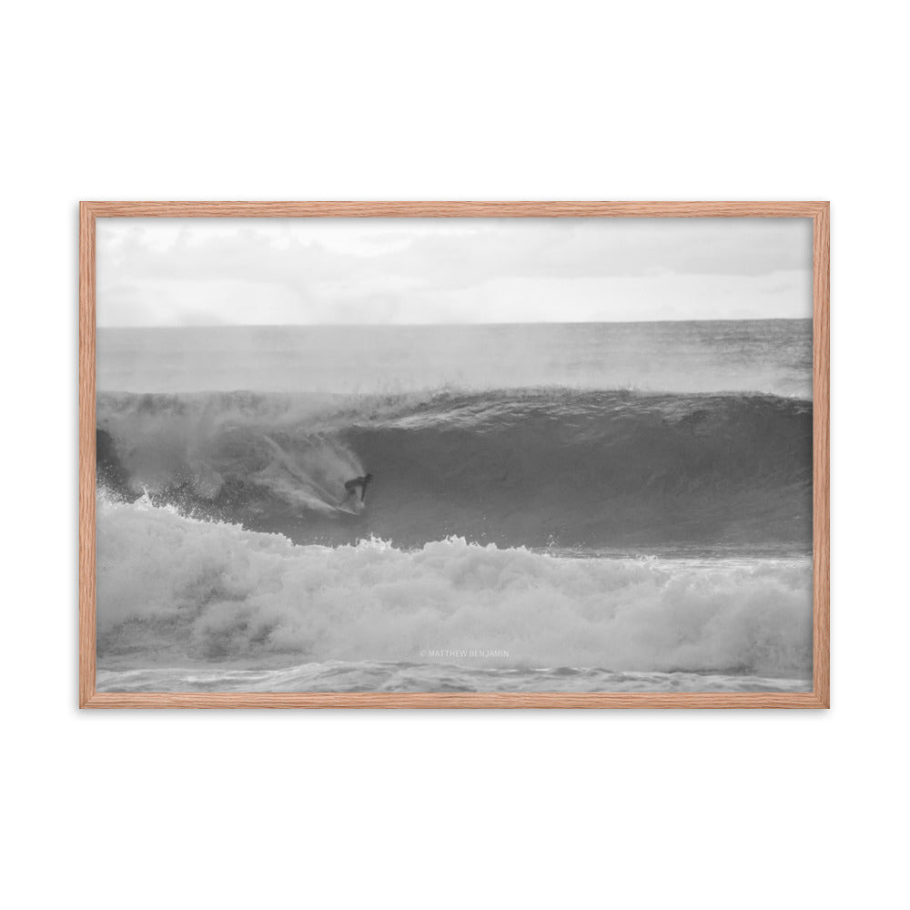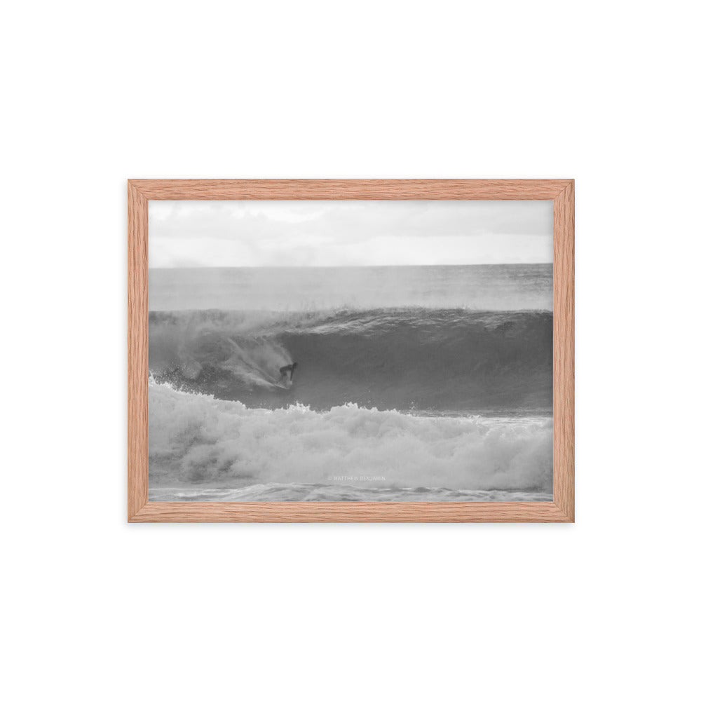 New Year's Eve in Hawaii. Located at the acclaimed Banzai Pipeline. Swells reached 20+ feet that day. The local Hawaiian news warned of high waves, so I rented a car and drove an hour to the infamous beach! 50 to 100 surfers sat and waited for these giants to roll and crash through. Even more onlookers at the beach sat and watched surfers push themselves to get just a few more waves in as the sun went down. I spoke with a surfer from Peru and he said sometimes these waves even reach 40 feet. A truly amazing experience I'll never forget. This is a framed poster printed on high-quality paper, with a partly glossy, partly matte finish.