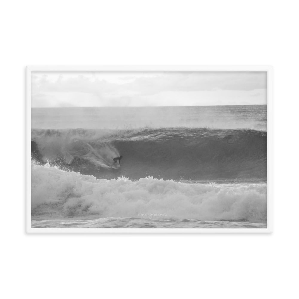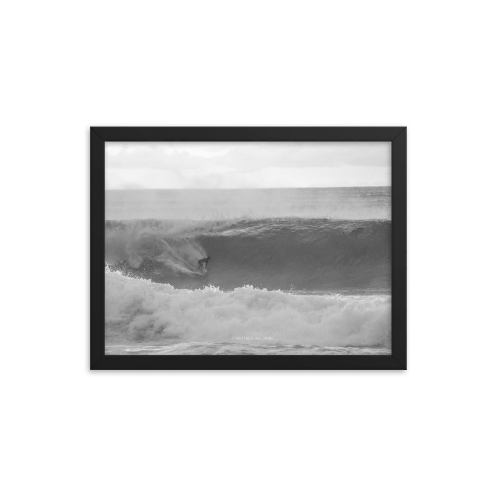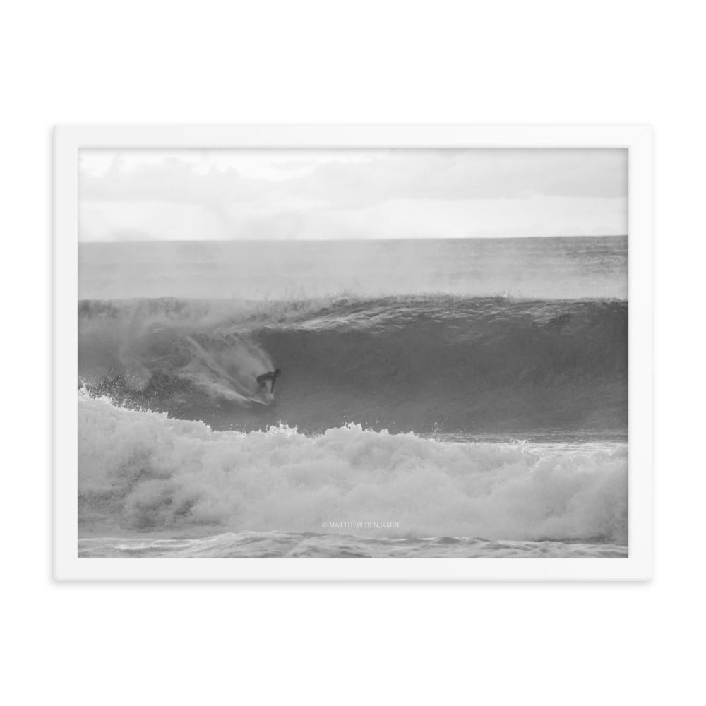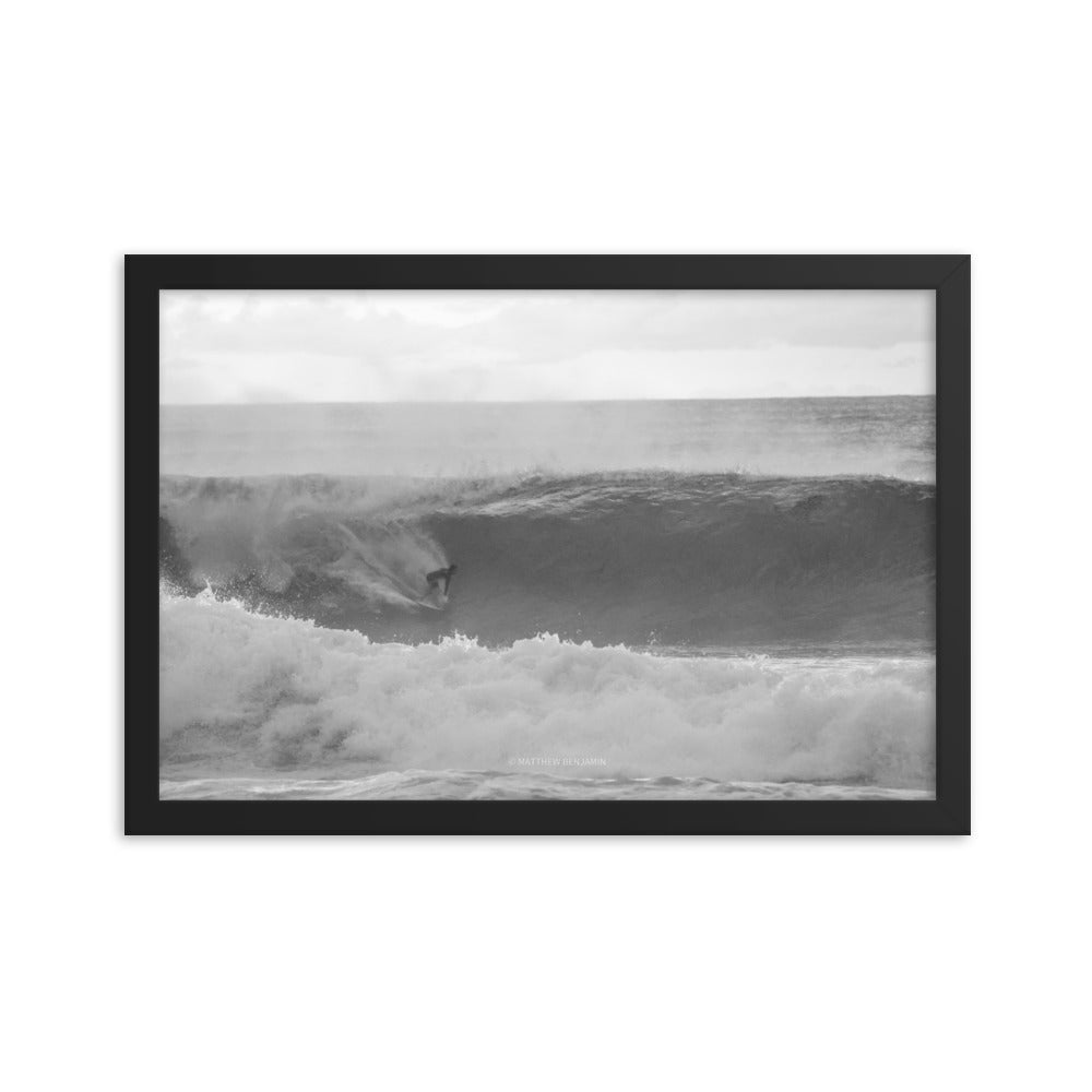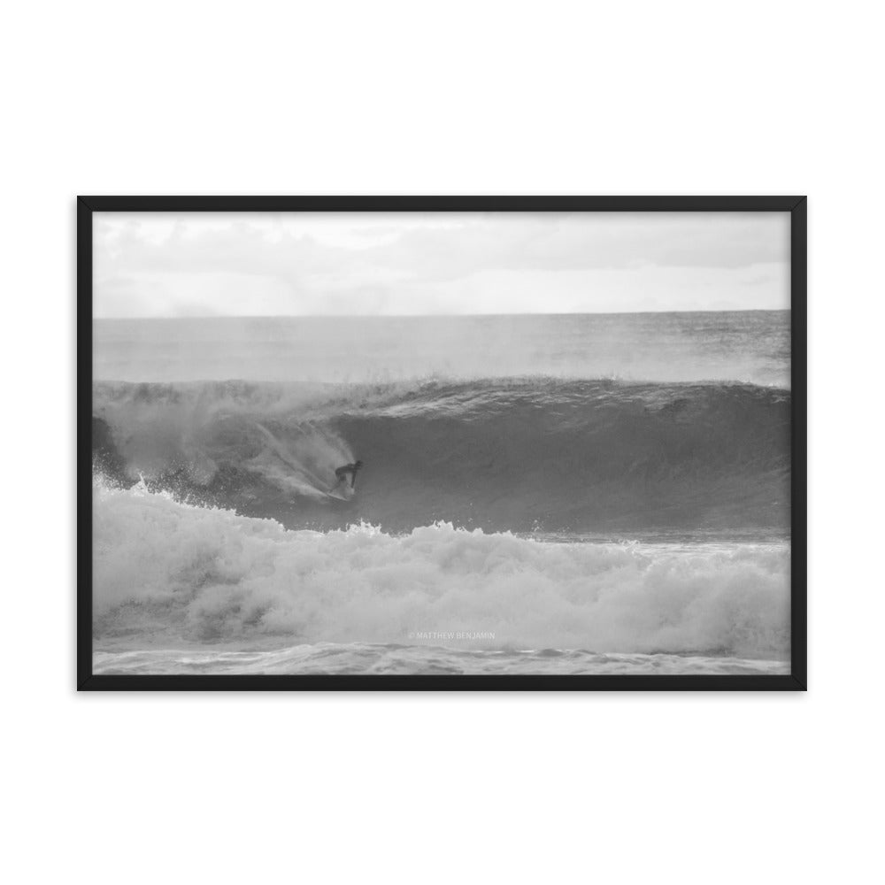 New Year's Eve in Hawaii. Located at the acclaimed Banzai Pipeline. Swells reached 20+ feet that day. The local Hawaiian news warned of high waves, so I rented a car and drove an hour to the infamous beach! 50 to 100 surfers sat and waited for these giants to roll and crash through. Even more onlookers at the beach sat and watched surfers push themselves to get just a few more waves in as the sun went down. I spoke with a surfer from Peru and he said sometimes these waves even reach 40 feet. A truly amazing experience I'll never forget. This is a framed poster printed on high-quality paper, with a partly glossy, partly matte finish.