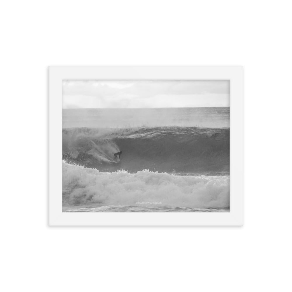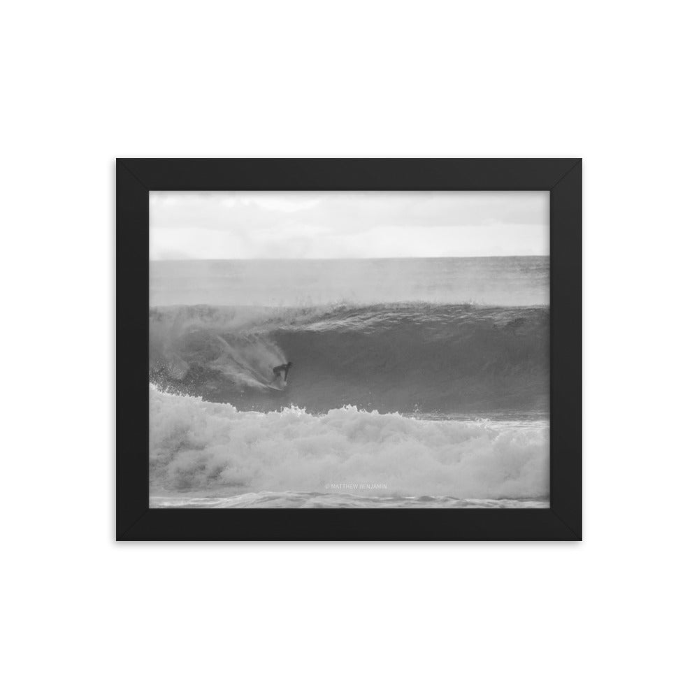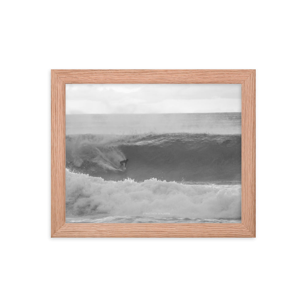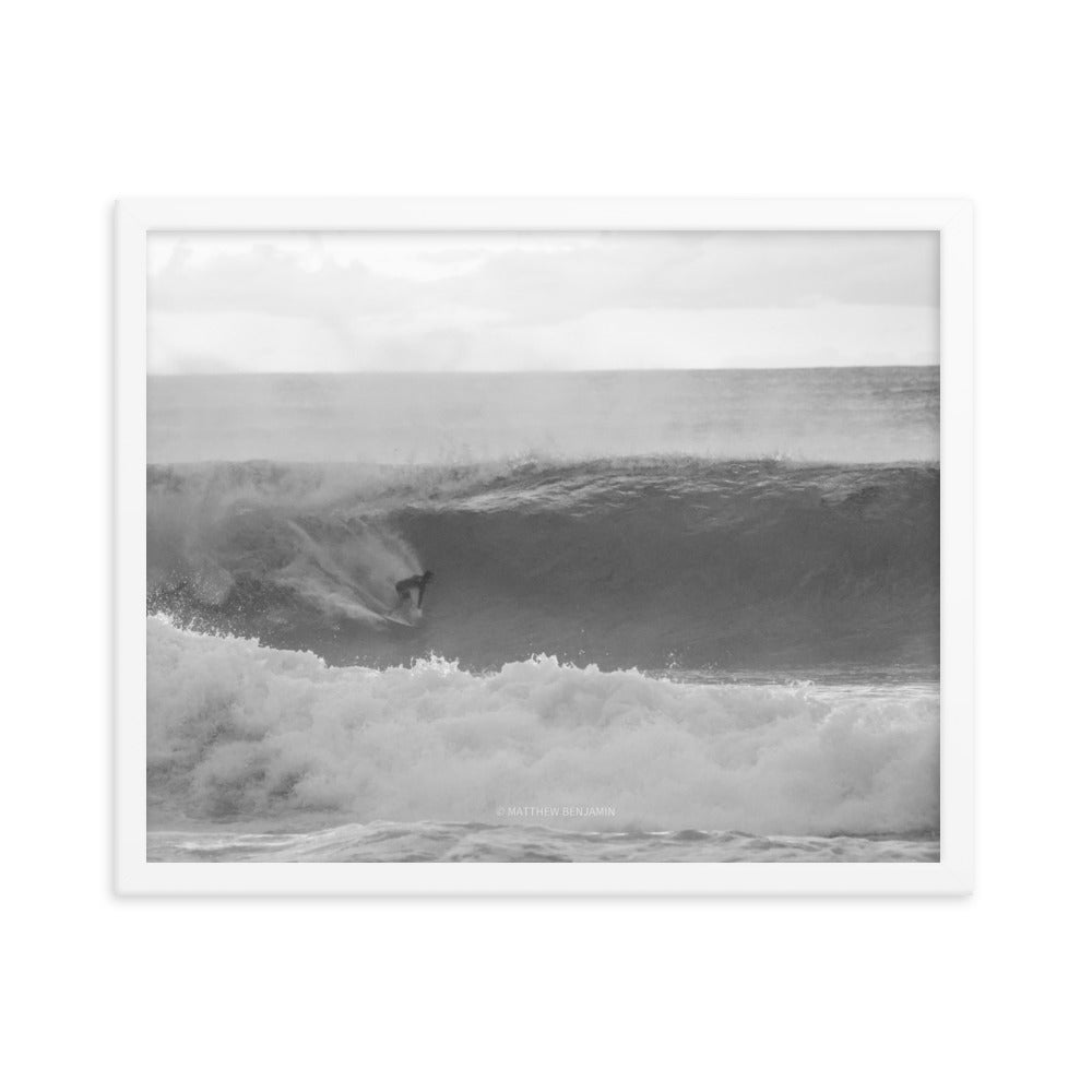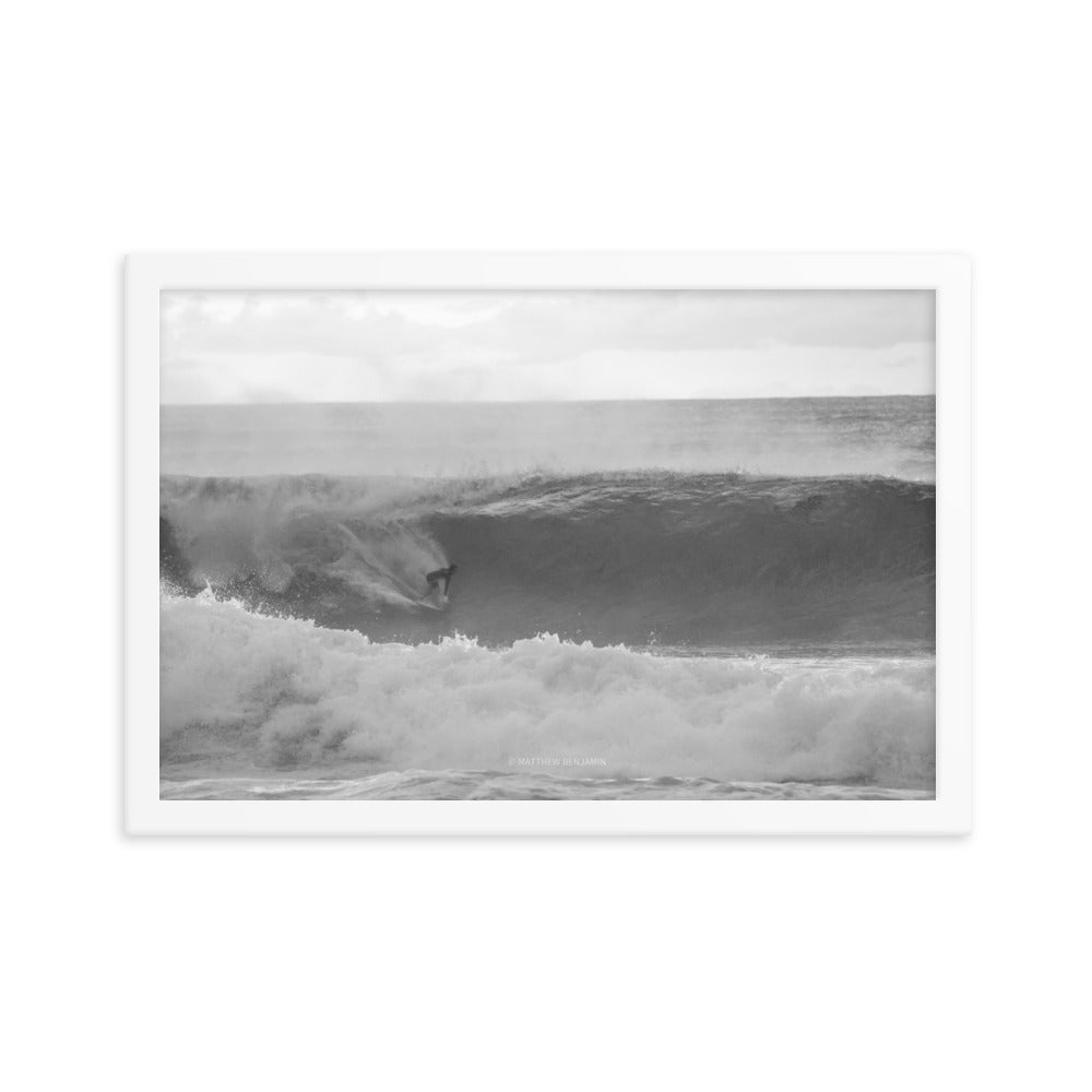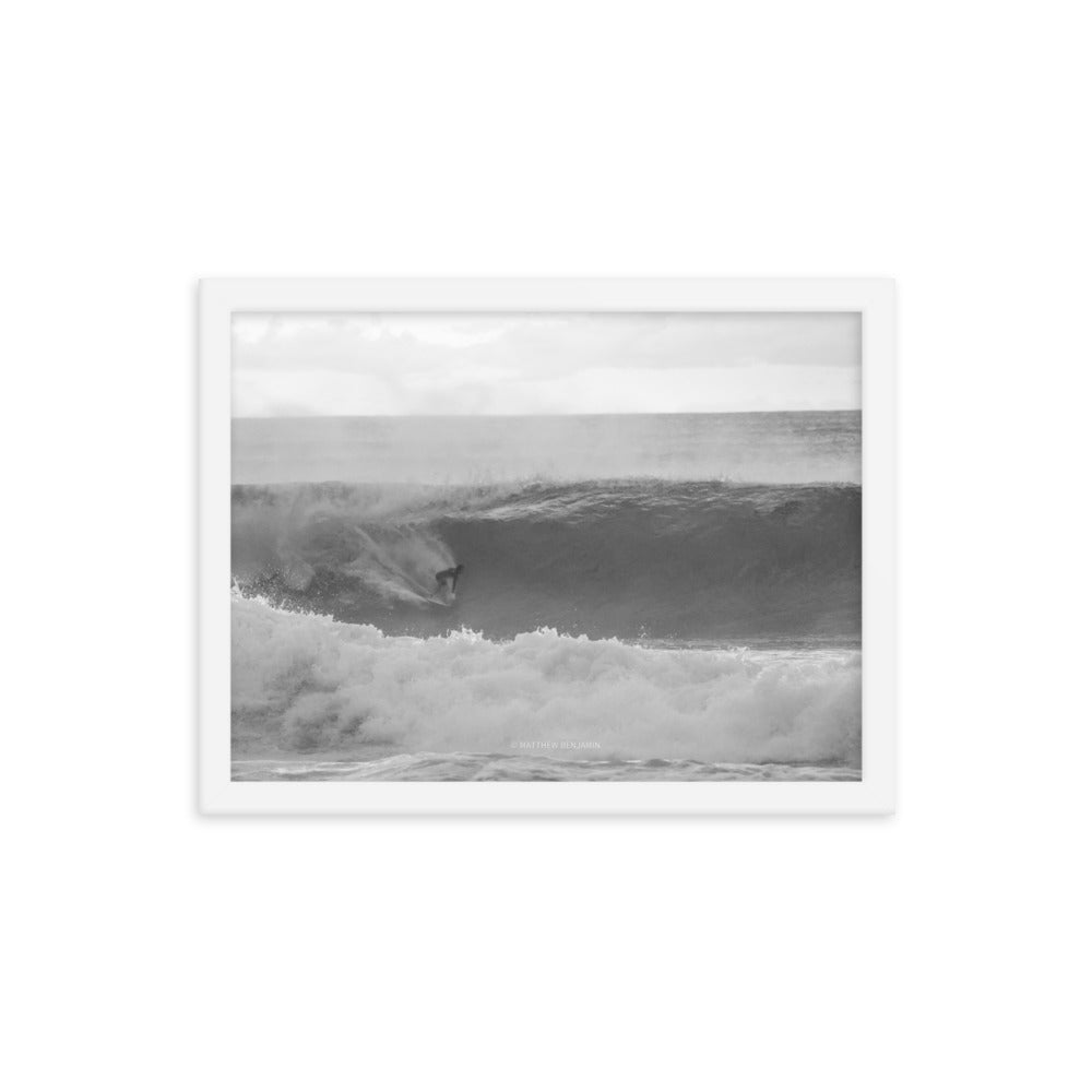 New Year's Eve in Hawaii. Located at the acclaimed Banzai Pipeline. Swells reached 20+ feet that day. The local Hawaiian news warned of high waves, so I rented a car and drove an hour to the infamous beach! 50 to 100 surfers sat and waited for these giants to roll and crash through. Even more onlookers at the beach sat and watched surfers push themselves to get just a few more waves in as the sun went down. I spoke with a surfer from Peru and he said sometimes these waves even reach 40 feet. A truly amazing experience I'll never forget. This is a framed poster printed on high-quality paper, with a partly glossy, partly matte finish.