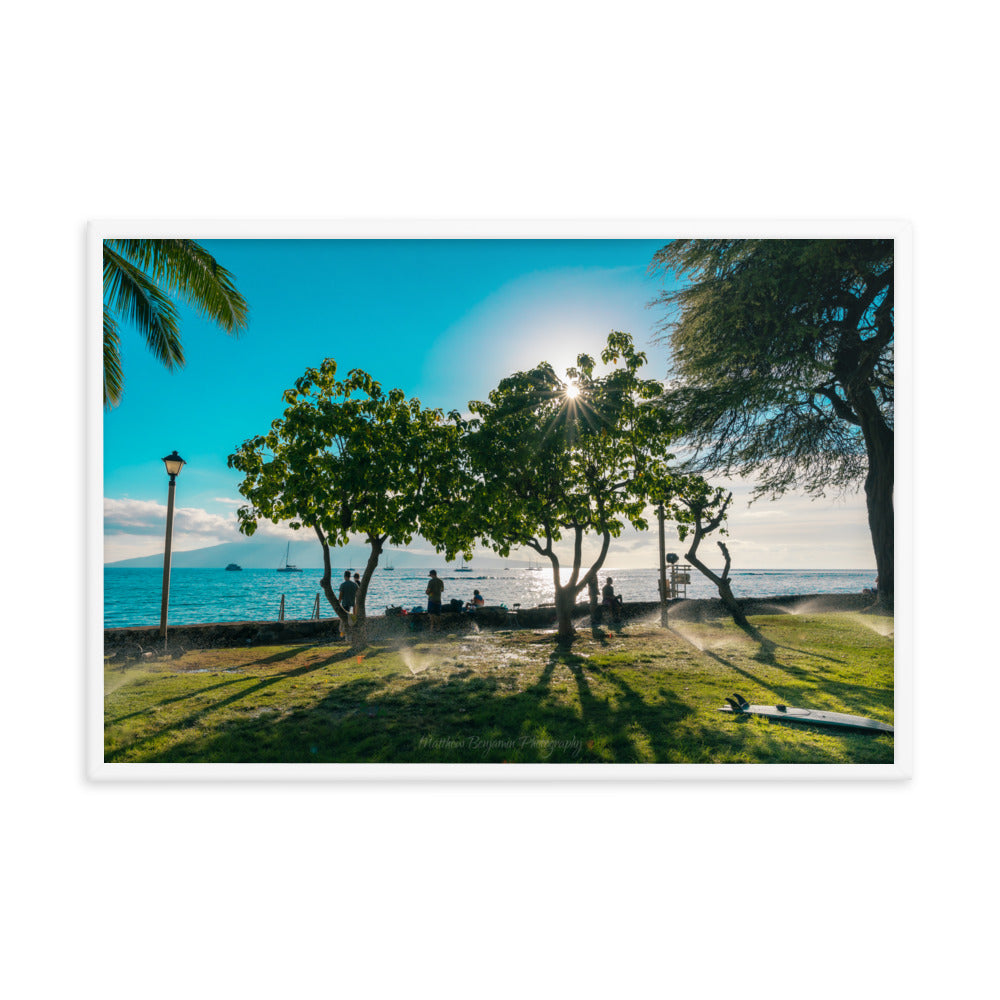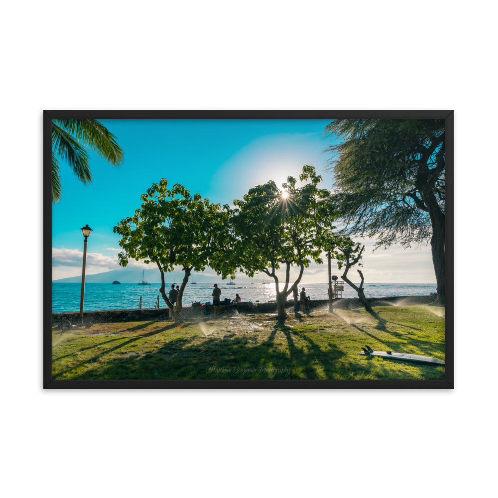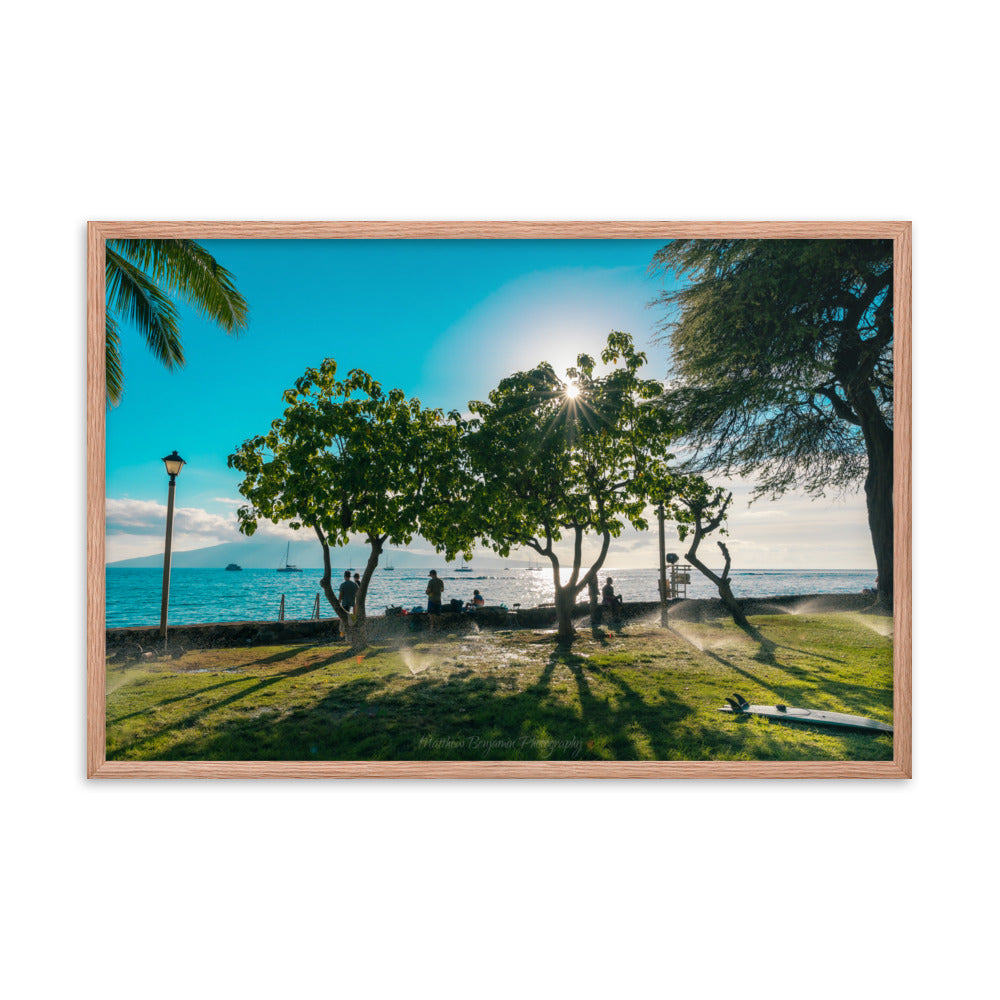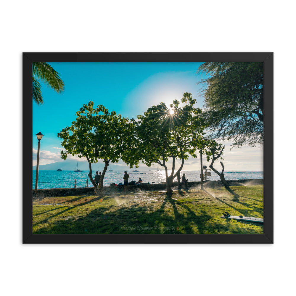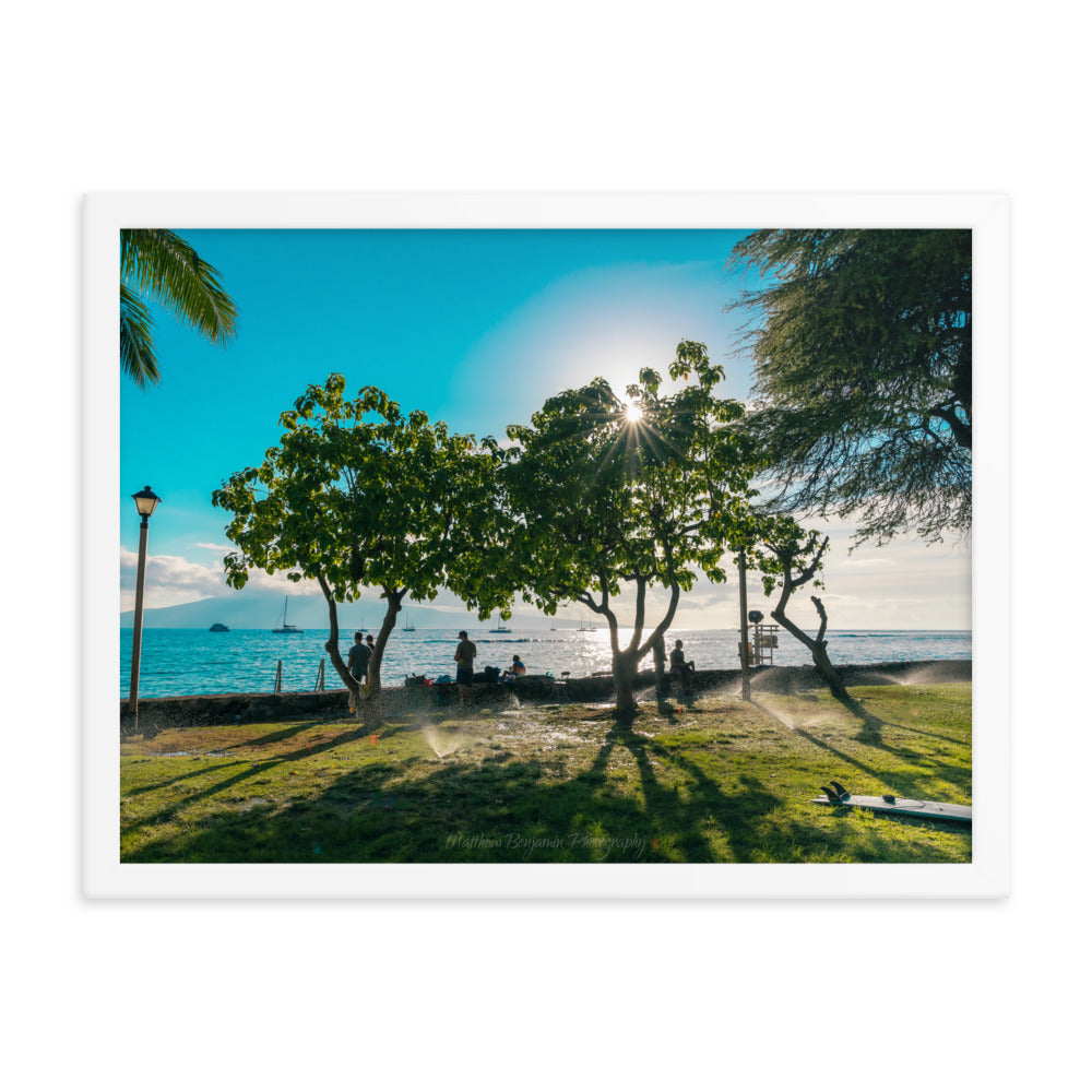 This is a surf family at the end of their surf session in Lahaina on Maui, Hawaii. The same Lahaina that was devastated and burnt in the wildfires. This photograph is a few months before it when it stood intact. I loved this town deeply which makes me deeply love this image. It is one of my first photographs I took while in Maui. This surfer family was ending their session at sunset, collecting their belongings while the sprinklers were on. I was outside the Lahaina Inn, a historic hotel (now gone), a beautiful girl sped by me on a Vespa. I turned around after the Vespa sped by and there stood this family winding down their surf session for the day.