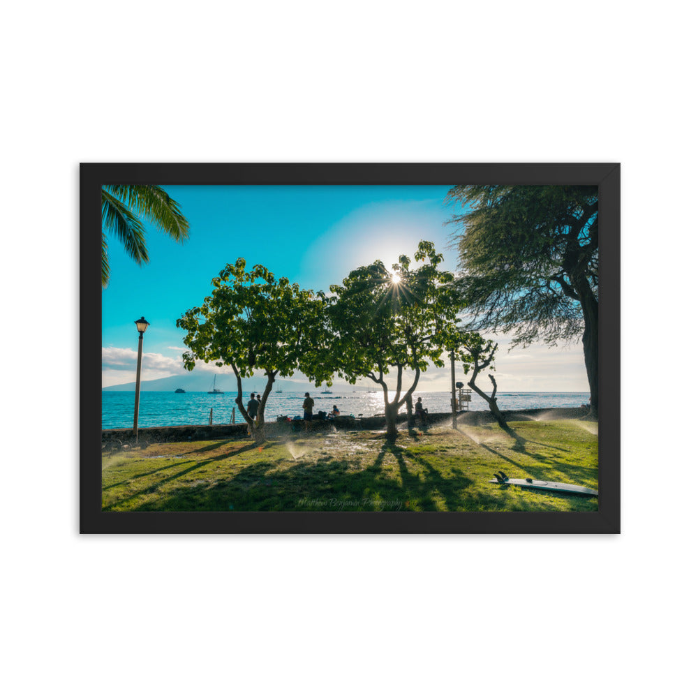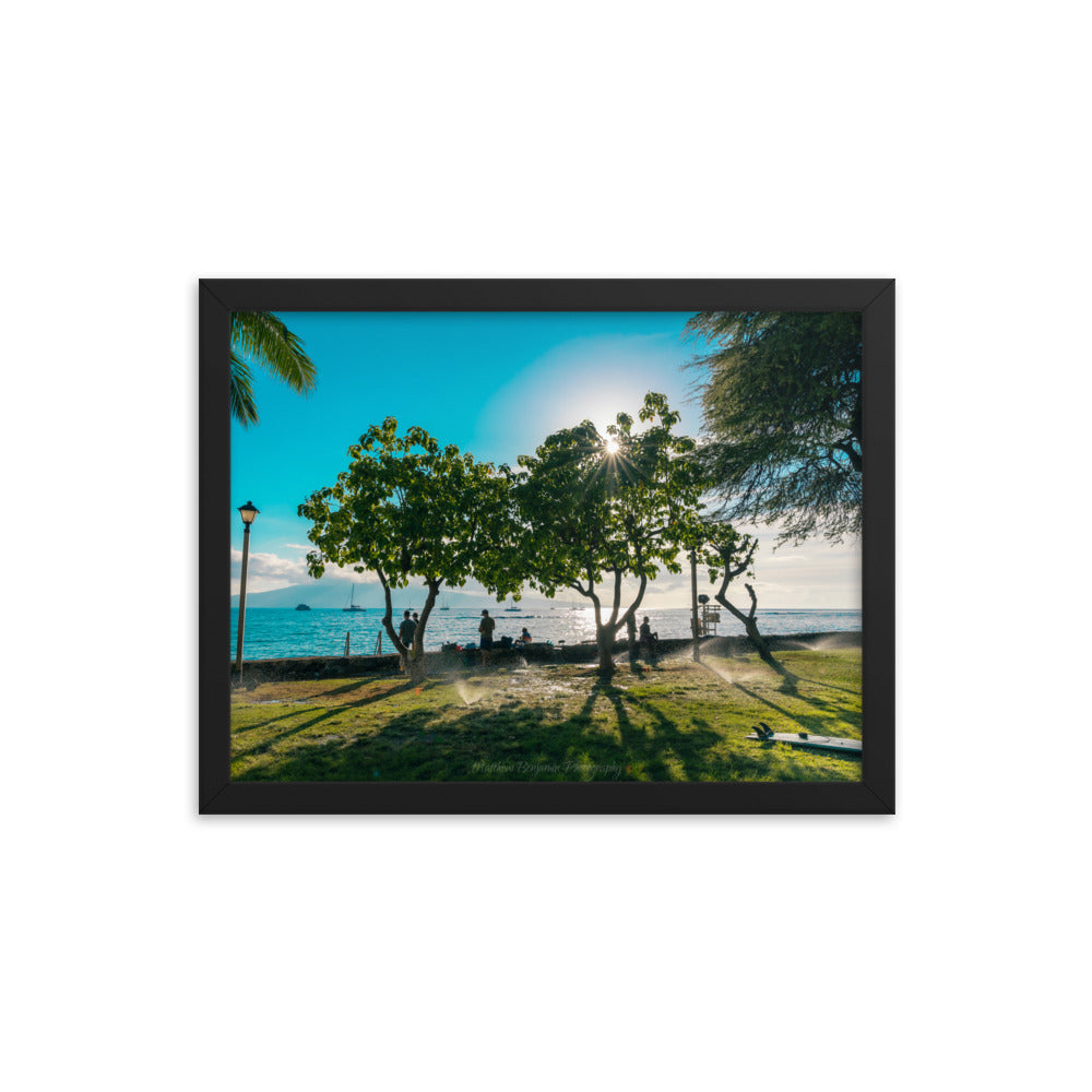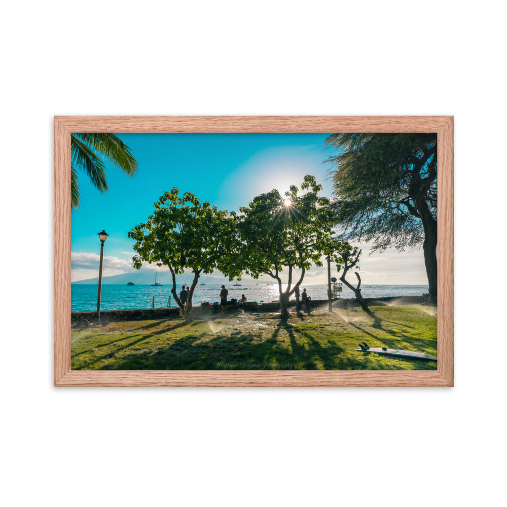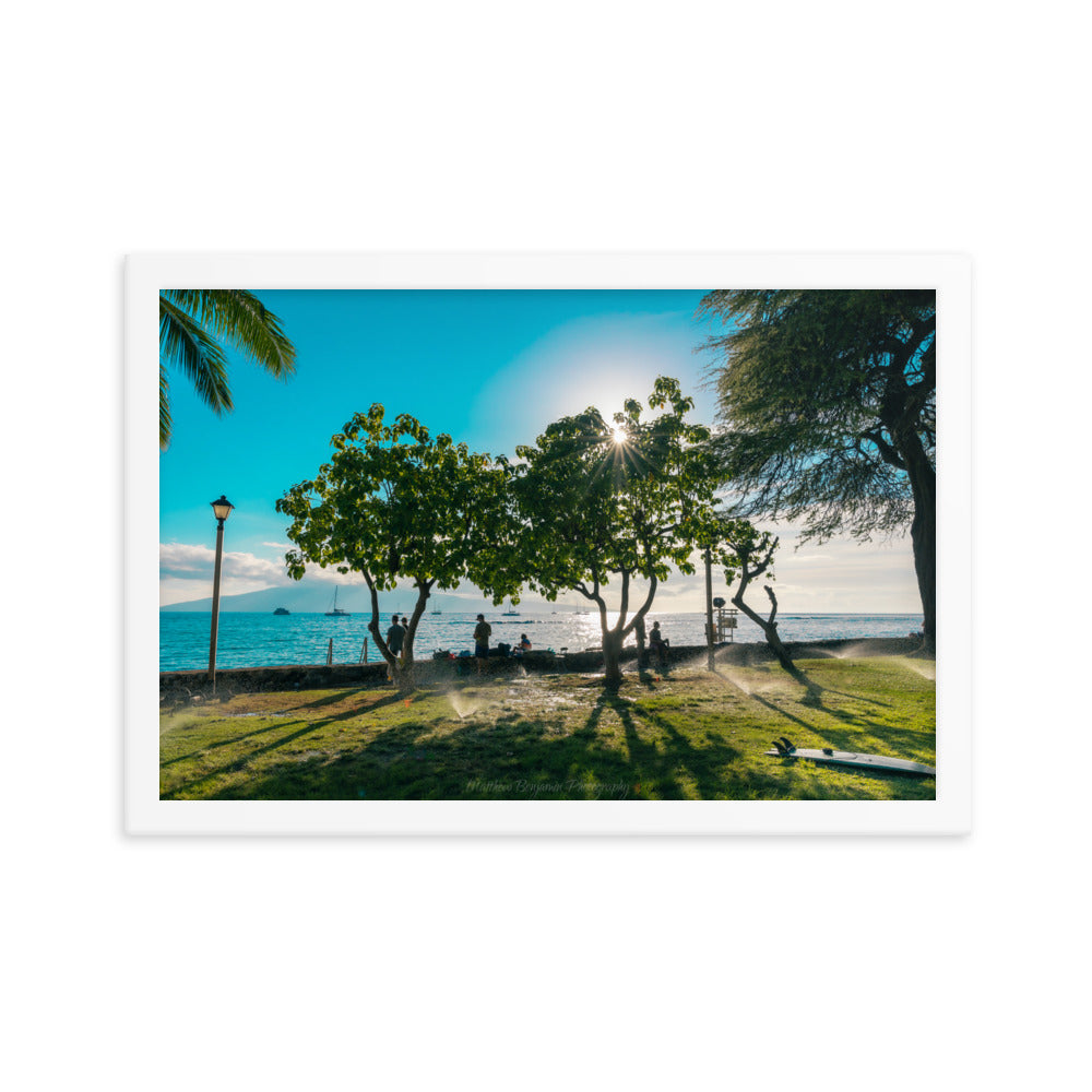This is a surf family at the end of their surf session in Lahaina on Maui, Hawaii. The same Lahaina that was devastated and burnt in the wildfires. This photograph is a few months before it when it stood intact. I loved this town deeply which makes me deeply love this image. It is one of my first photographs I took while in Maui. This surfer family was ending their session at sunset, collecting their belongings while the sprinklers were on. I was outside the Lahaina Inn, a historic hotel (now gone), a beautiful girl sped by me on a Vespa. I turned around after the Vespa sped by and there stood this family winding down their surf session for the day.