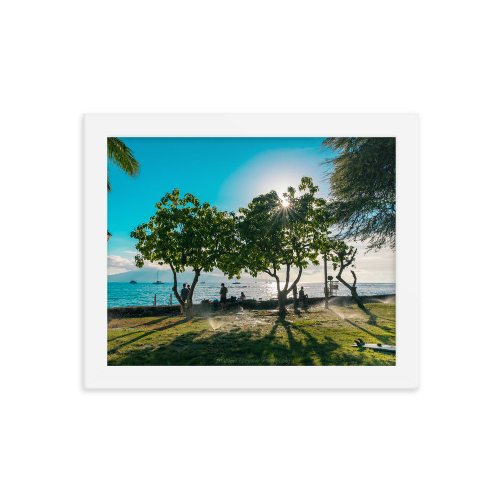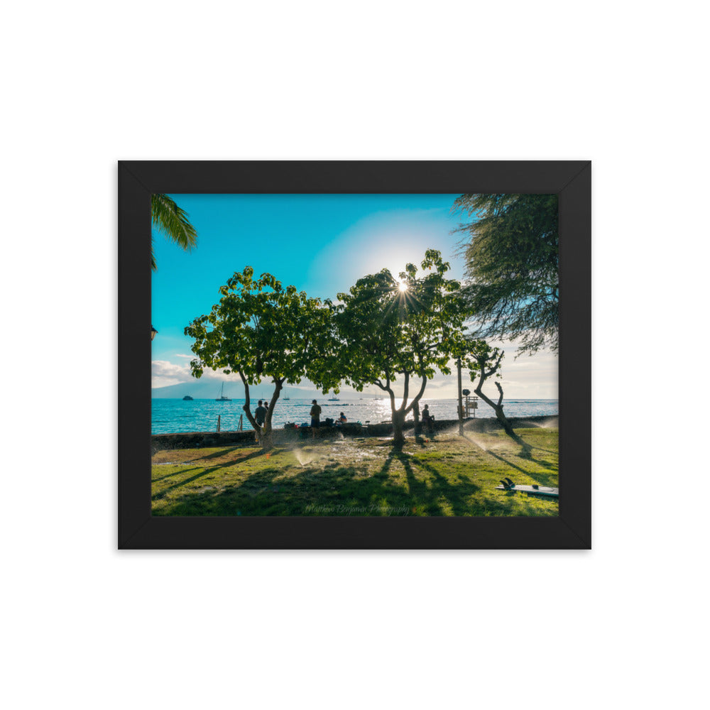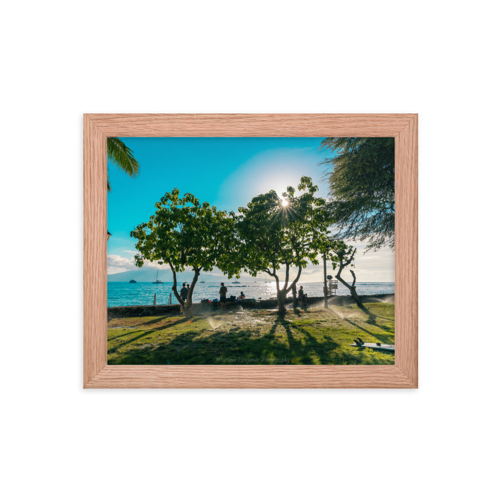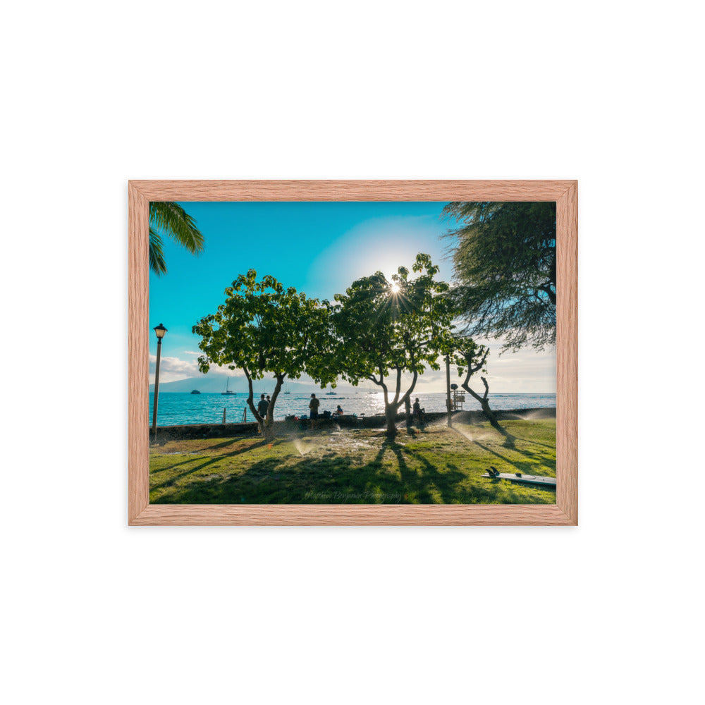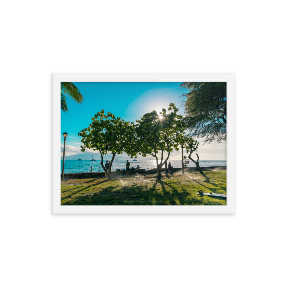 This is a surf family at the end of their surf session in Lahaina on Maui, Hawaii. The same Lahaina that was devastated and burnt in the wildfires. This photograph is a few months before it when it stood intact. I loved this town deeply which makes me deeply love this image. It is one of my first photographs I took while in Maui. This surfer family was ending their session at sunset, collecting their belongings while the sprinklers were on. I was outside the Lahaina Inn, a historic hotel (now gone), a beautiful girl sped by me on a Vespa. I turned around after the Vespa sped by and there stood this family winding down their surf session for the day.