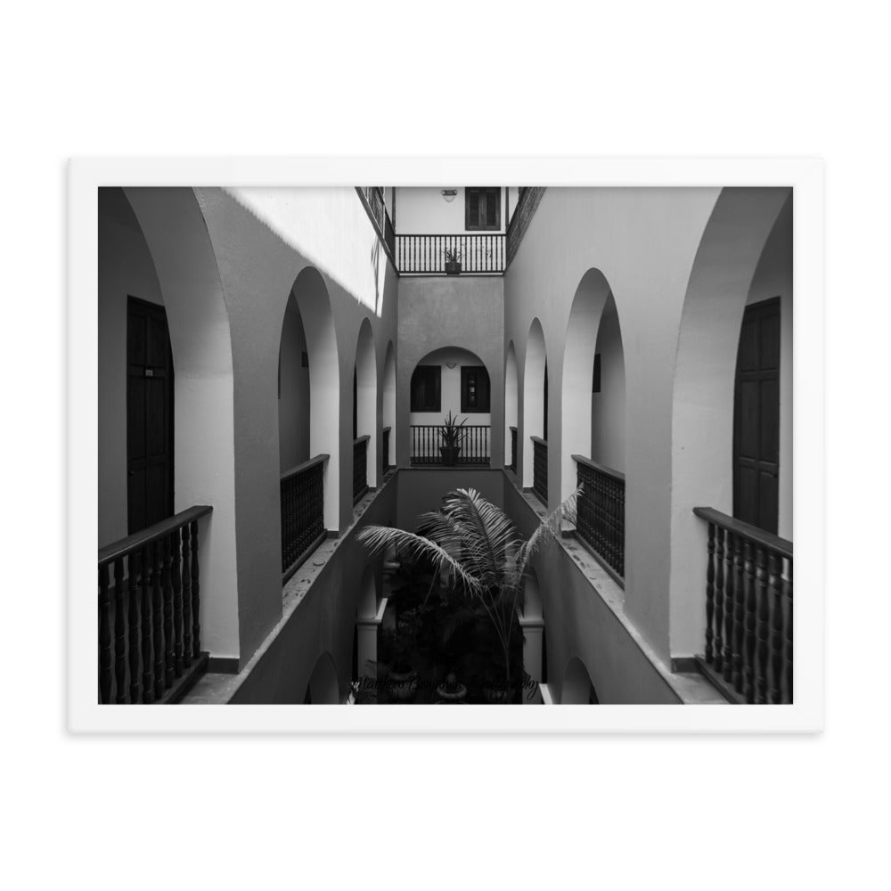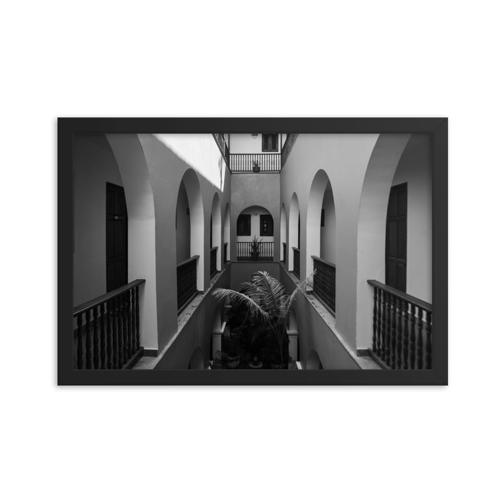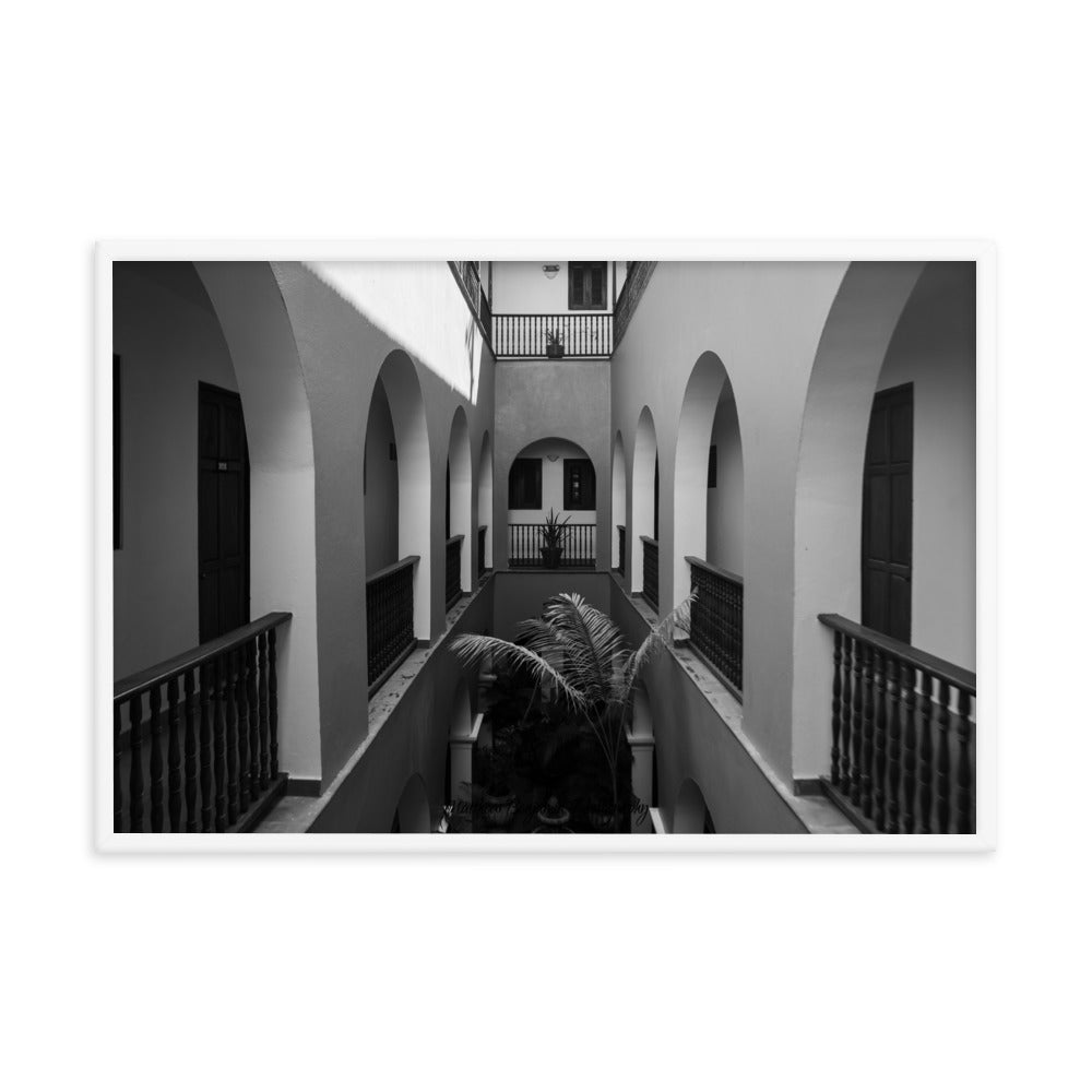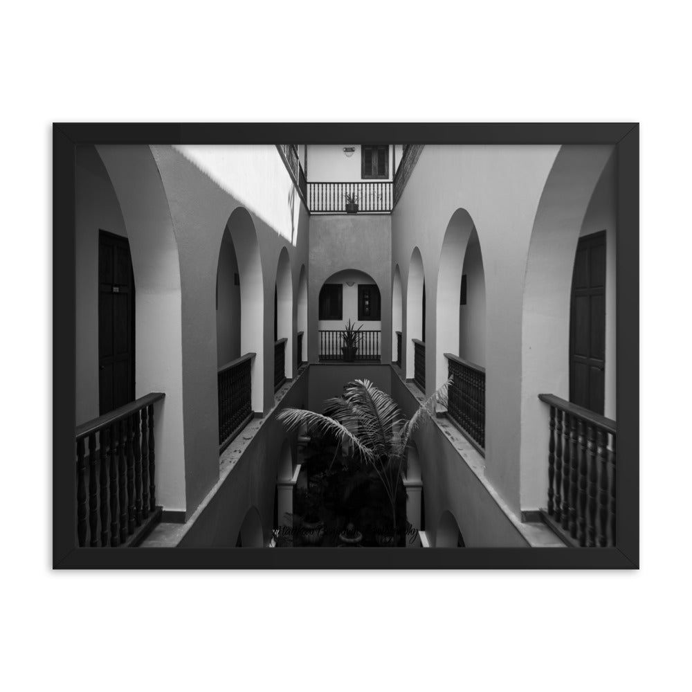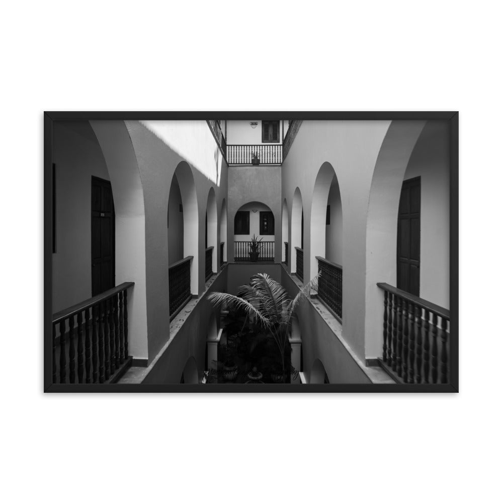 This is an apartment building's courtyard I stayed at in Old San Juan. It was a multiple story building right off of a brick road. This place was so cool! There are other photographs of this building in my portfolio because it was that cool! Make a statement in any room with this framed poster printed on high-quality paper, with a partly glossy, partly matte finish.