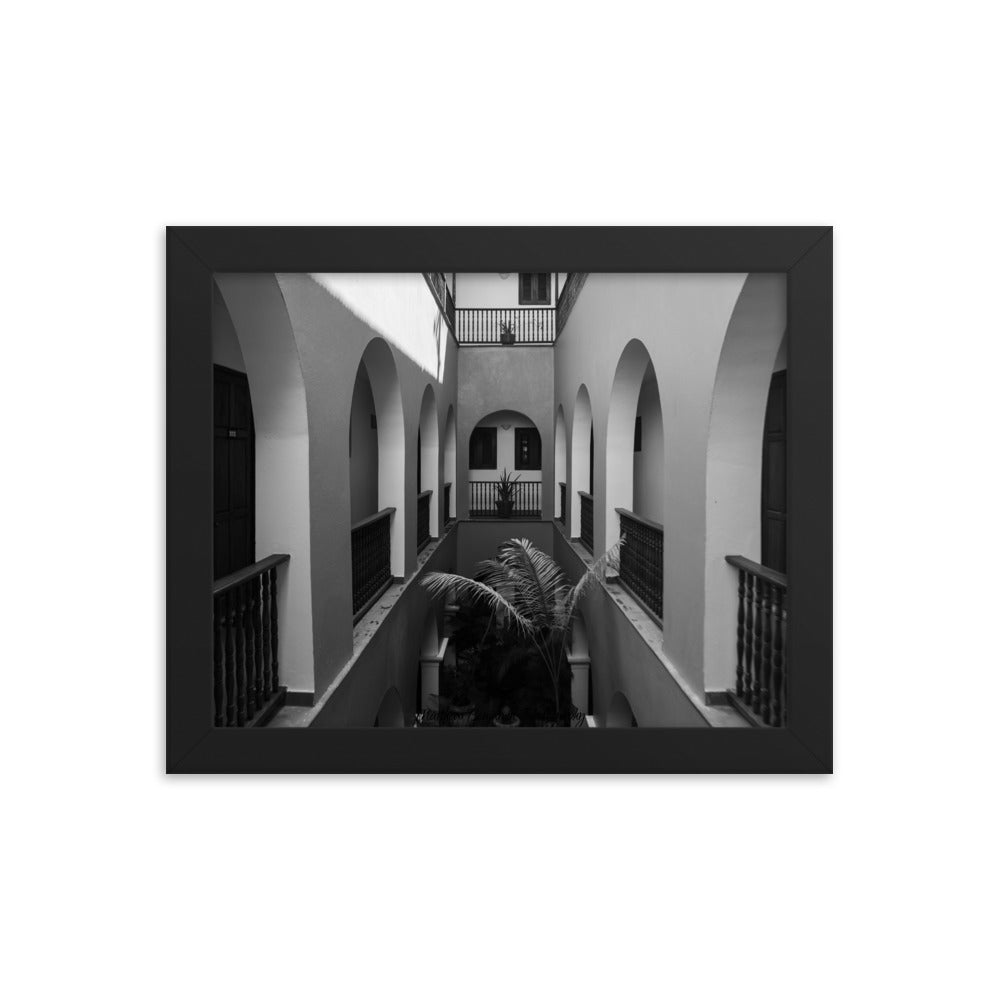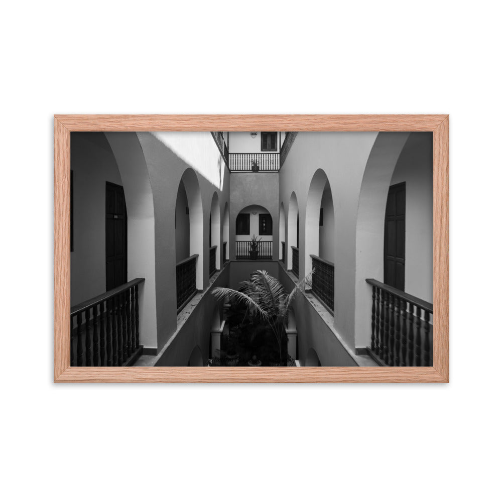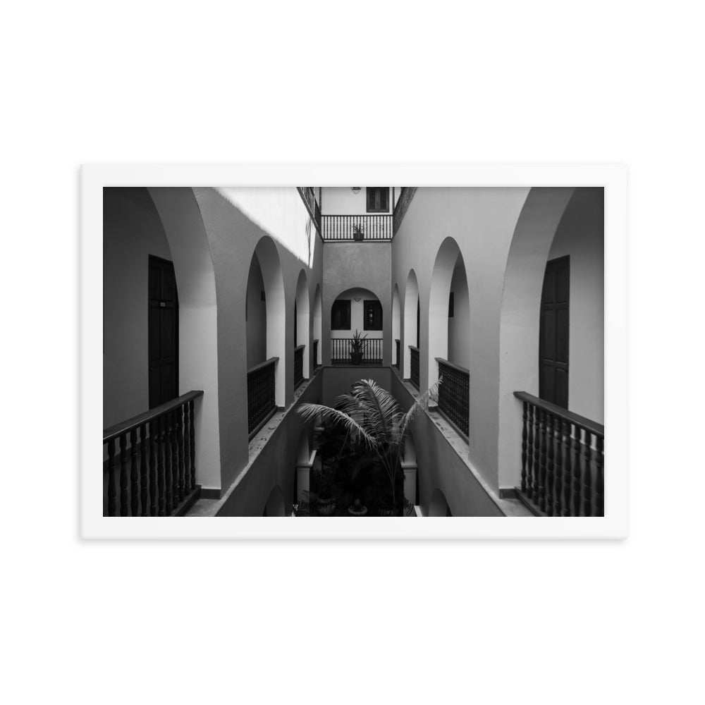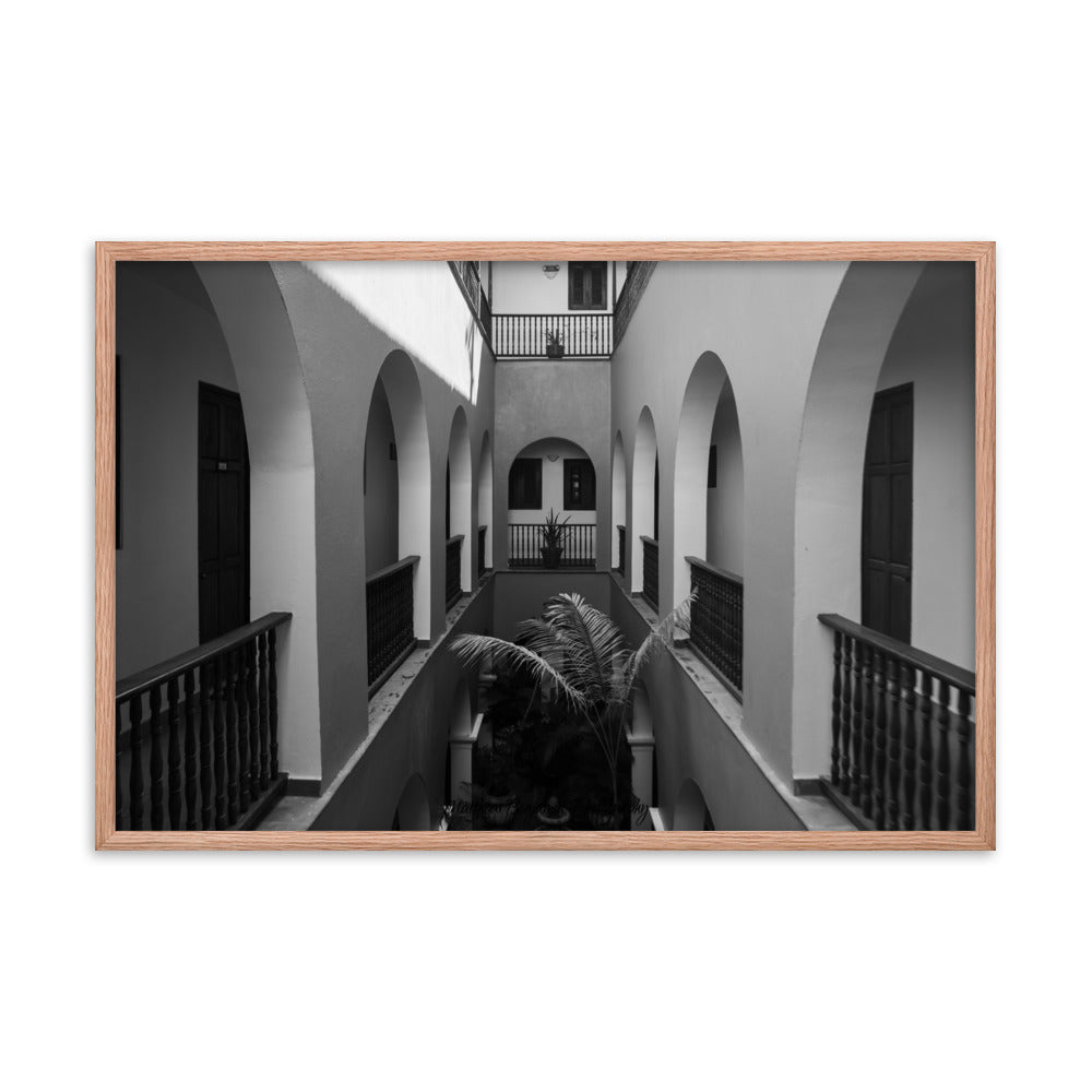 This is an apartment building's courtyard I stayed at in Old San Juan. It was a multiple story building right off of a brick road. This place was so cool! There are other photographs of this building in my portfolio because it was that cool! Make a statement in any room with this framed poster printed on high-quality paper, with a partly glossy, partly matte finish.