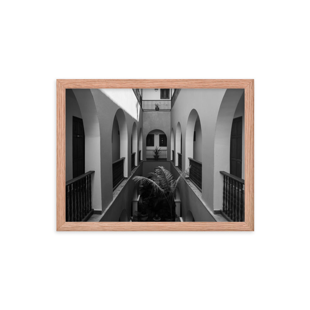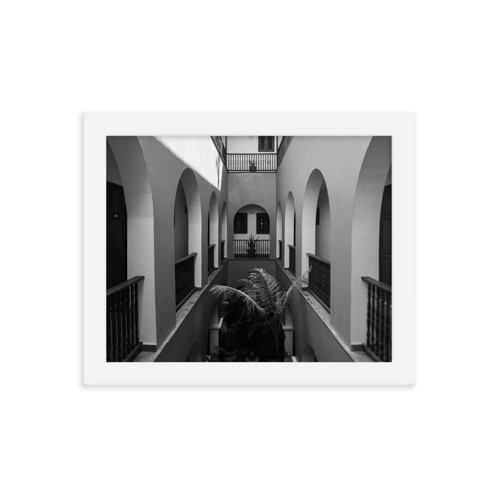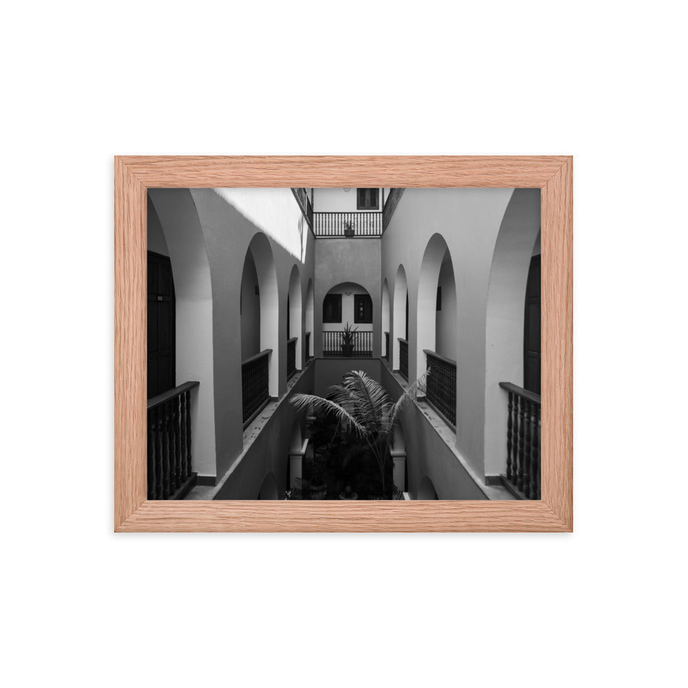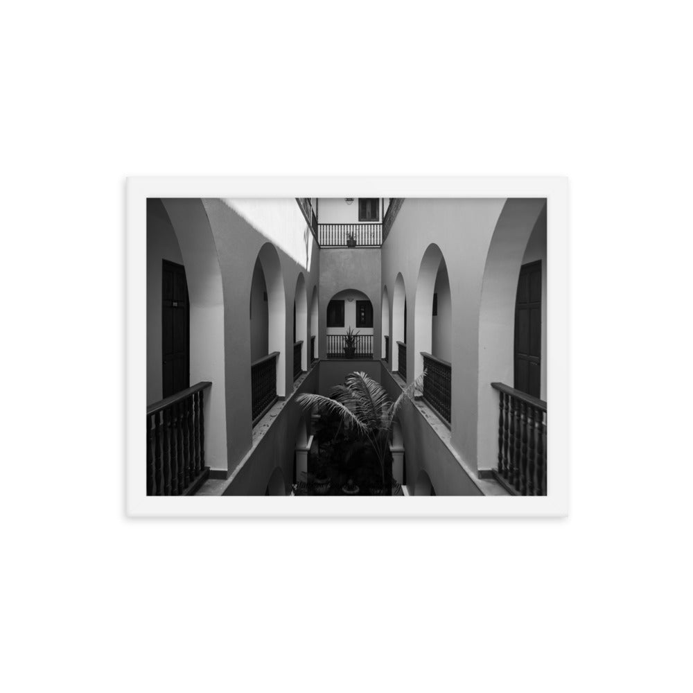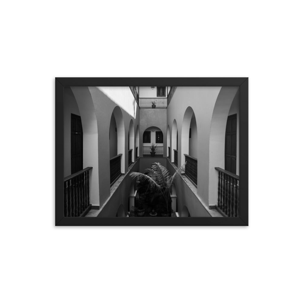 This is an apartment building's courtyard I stayed at in Old San Juan. It was a multiple story building right off of a brick road. This place was so cool! There are other photographs of this building in my portfolio because it was that cool! Make a statement in any room with this framed poster printed on high-quality paper, with a partly glossy, partly matte finish.